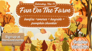 Ready for a bonfire, s’mores, hotdogs, hayrides, and pumpkin chunkin’? On November 15, the students (grades 6-12) are going to the Martin’s farms for an evening of fall fun. We will take a bus from the church to their farm and then have a hayride out to the creek where the fun awaits!