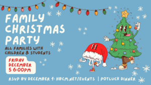 Join us for our Family Christmas Party on Friday, December 5 at 6pm in the Oasis. All families with kids and students are invited to kick off the Christmas season with a potluck dinner, Christmas games, and Christmas sweaters. RSVP by December 1. Contact Alana Robinette or Zac Caldwell with questions.
