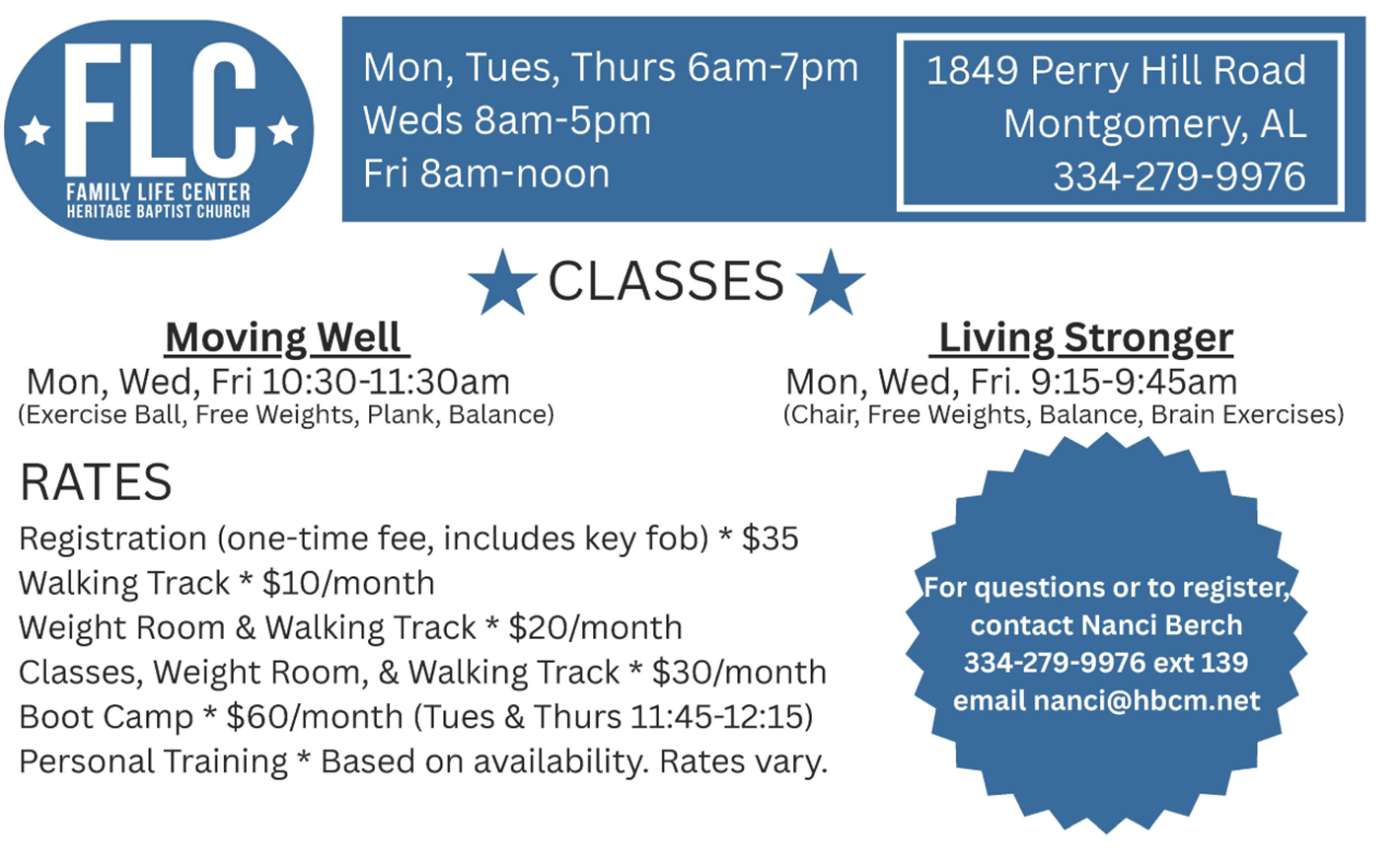 Nanci Berch has been serving Heritage Baptist Church since December 2015. She is the Family Life Center Director, Personal Trainer and Fitness Coordinator. Nanci has been a certified personal trainer for 22 years and a group fitness instructor for 5 years. She has a bachelor’s degree from Huntingdon College in Human Performance and Kinesiology, and a master’s degree in Exercise Science from University of Alabama. Nanci loves working at Heritage because she gets to meet so many different people in different walks of life who have the same goal: to be healthy. She says Heritage and the Family Life Center can help with your mental health, physical health, and spiritual health. Nanci has been married to John for 21 years. They have three children: Tripp, Reid, and Isabella. They also have a dog named Brownie.